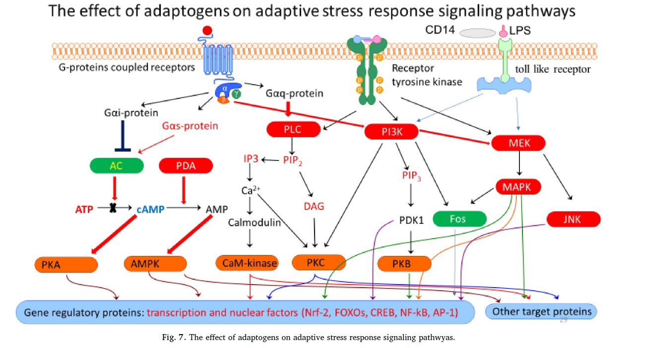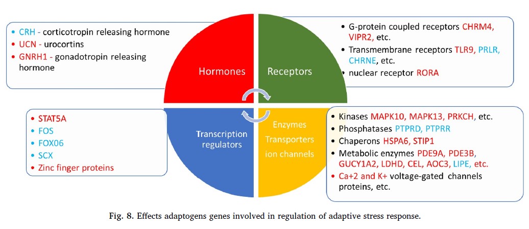 The term ‘adaptogen’ refers to natural compounds or plant extracts that increase adaptability and survival of organisms to stress. They exhibit anti-fatigue effects during stress and show promising potential against age-related conditions. Adaptogens stimulate cellular and organism defense systems by means: - activating intracellular and extracellular signaling pathways and expression of stress-activated proteins and neuropeptides; - enhancing survival against oxidative stress; - ameliorating and postponing aging by activation of mediator genes of stress response and modulation of longevity pathways. Scientific community is trying to identify key molecular mechanisms that are in common among more than 70 plants which have adaptogenic action, to provide a rationale for the use of adaptogens in stress- and age-related diseases, as shown in the following pictures (retrieved from Panossian et al., 2018).
