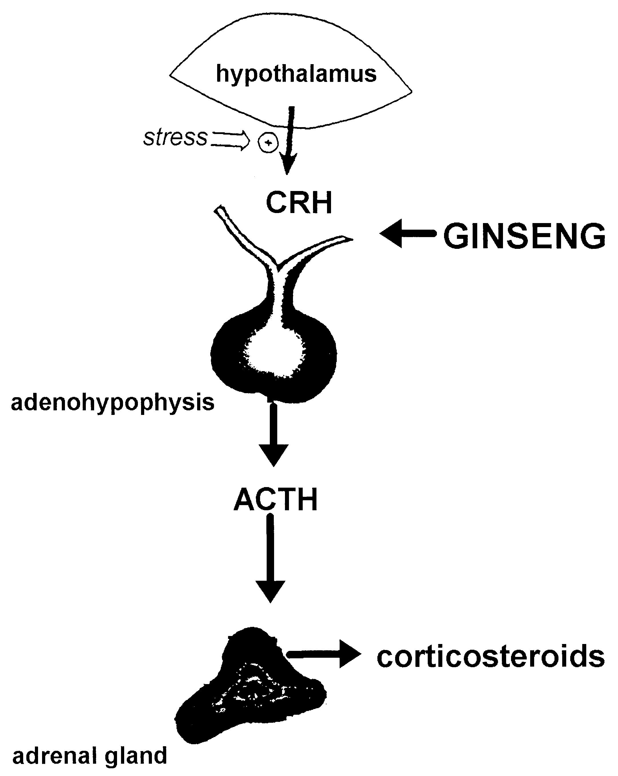 Ginseng adaptogenic effect is apparently a function of the ginsenoside saponin glycosides contained in the root and are linked to a corticosteroid-like action. In fact, endocrinological studies have suggested that ginsenosides may augment adrenal steroidogenesis (production of steroid hormones) via an indirect action on the pituitary gland. The hormones produced by the hypothalamus-pituitary-adrenal axis are well known to play a significant role in the adaptation capabilities of the body. In the picture the involvement of Ginseng is shown (retrieved from Nocerino et al., 2000).